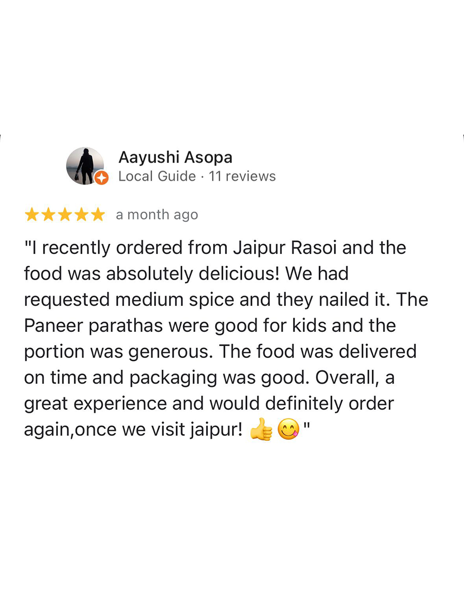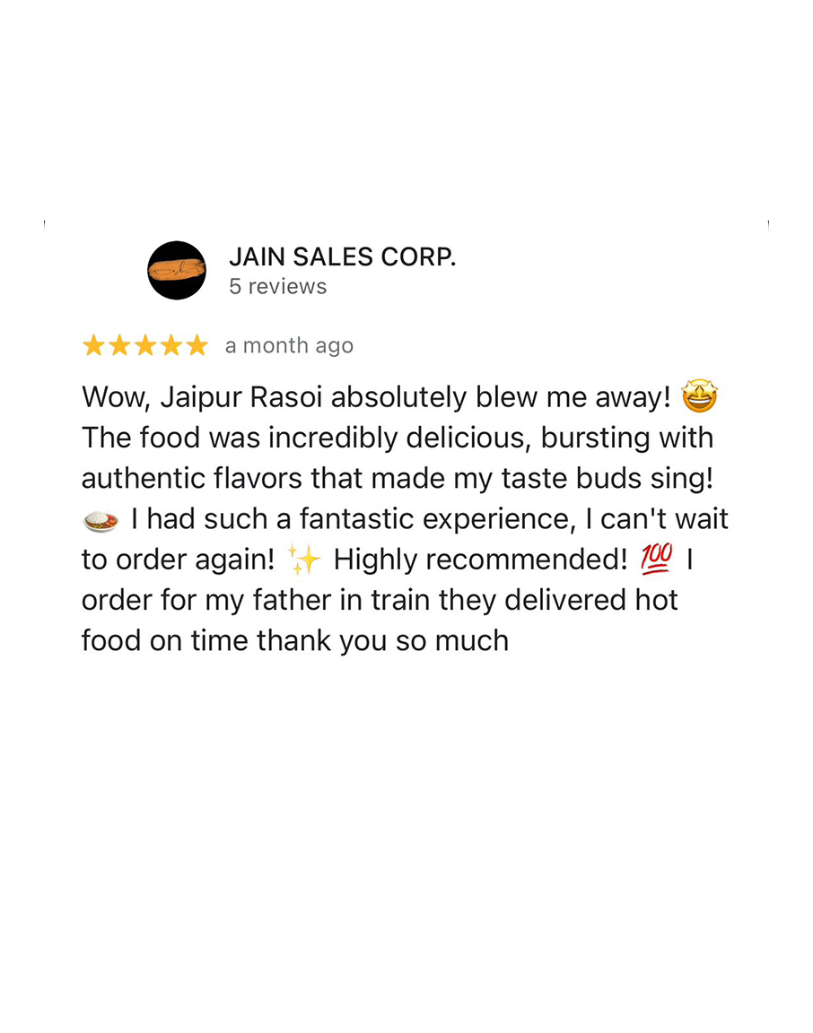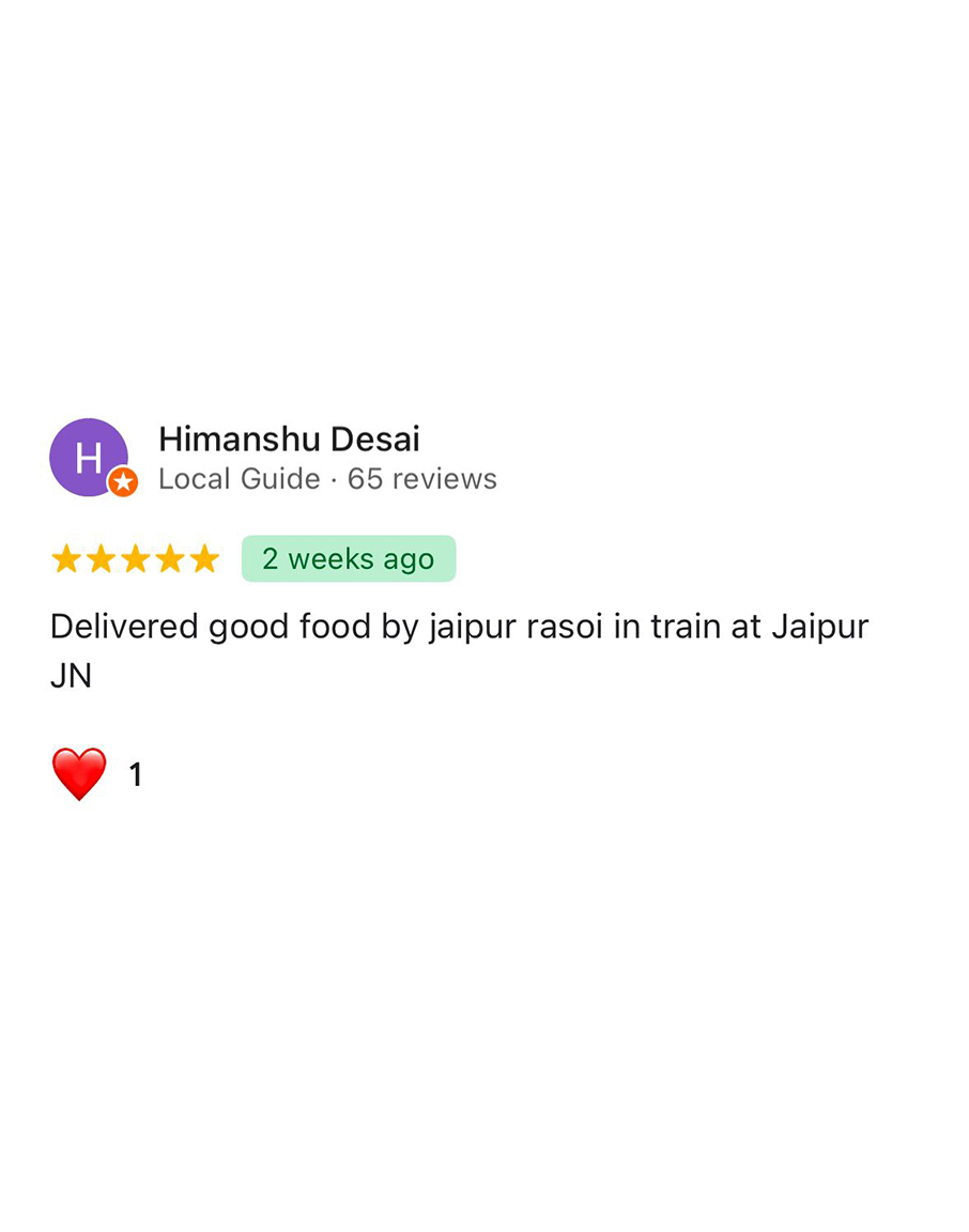 Jaipur Rasoi focuses on providing clean, hygienic, and high-quality meals to train passengers traveling through Jaipur Junction. All meals are prepared in FSSAI-certified kitchens following strict food safety standards. From freshly cooked thalis to light snacks and beverages, every order is packed carefully to ensure freshness and taste.